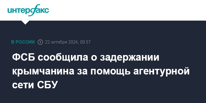 Москва. 22 октября. INTERFAX.RU - ФСБ сообщила о задержании в Крыму местного жителя, подозреваемого в помощи агентурной сети Службы безопасности Украины (СБУ).