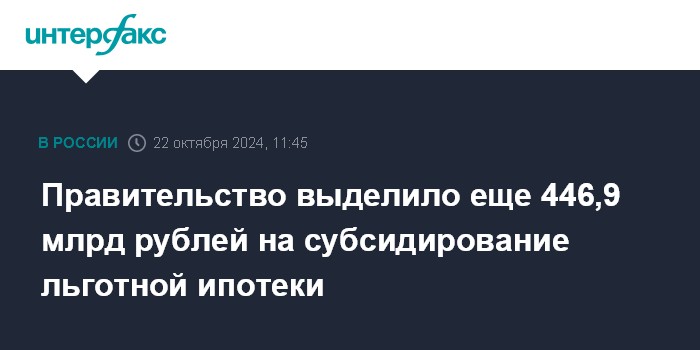 "На субсидирование процентной ставки по программам "Семейная ипотека", "Дальневосточная и арктическая ипотека", а также "Льготная ипотека" из резервного фонда кабмина будет дополнительно направлено 446,9 млрд рублей", - сказано в пресс-релизе.
