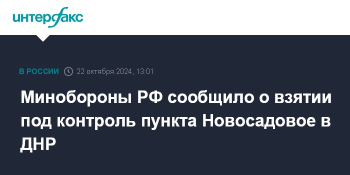 Москва. 22 октября. INTERFAX.RU - Войска группировки "Запад" взяли под контроль населённый пункт Новосадовое в Донецкой народной республике, сообщает министерство обороны РФ.