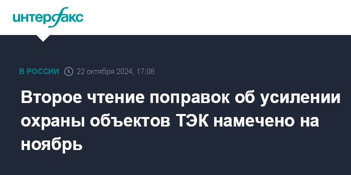 Москва. 22 октября. INTERFAX.RU - Законопроект об усилении безопасности объектов ТЭК путем расширения полномочий ведомственной охраны и частных охранных предприятий, планируется в ноябре подготовить ко второму чтению, сообщил зампредседателя комитета Госдумы по энергетике Юрий Станкевич на конференции "Нефтекокс 2024".