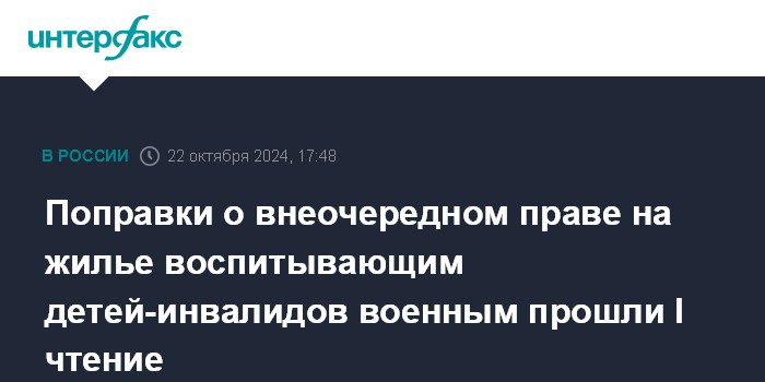 Москва. 22 октября. INTERFAX.RU - Госдума единогласно одобрила в первом чтении законопроект, который предусматривает внеочередное право на жилье или жилищную субсидию военнослужащим, воспитывающим детей-инвалидов.