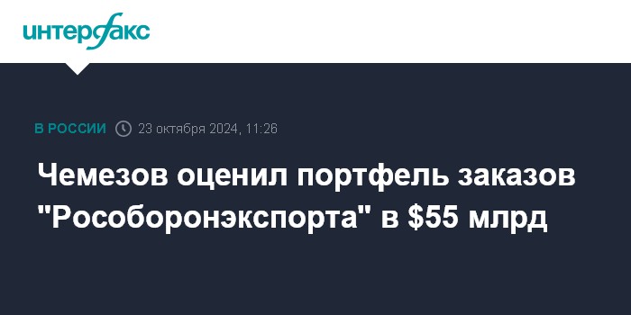 Москва. 23 октября. INTERFAX.RU - Портфель экспортных оружейных заказов "Рособоронэкспорта" составляет около $55 млрд, сообщил глава государственной корпорации "Ростех" Сергей Чемезов.