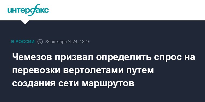 Москва. 23 октября. INTERFAX.RU - Формирование маршрутной сети вертолетных перевозок в России позволит определить спрос на этот вид авиатехники, считает глава "Ростеха" Сергей Чемезов. Он заявил об этом в Совете Федерации.