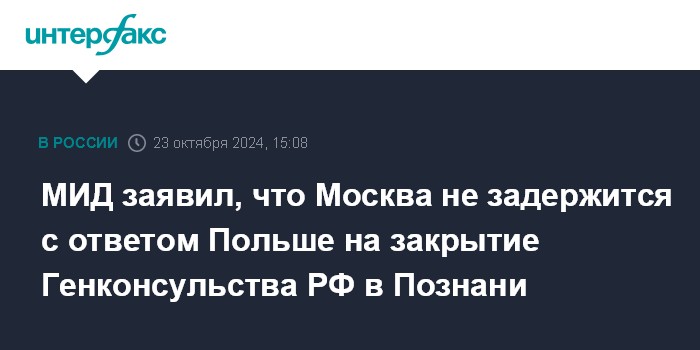 Москва. 23 октября. INTERFAX.RU - Москва адекватно ответит на решение властей Польши закрыть генконсульство России в Познани, заявила официальный представитель МИД РФ Мария Захарова
