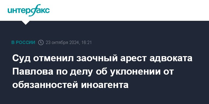 Москва. 23 октября. INTERFAX.RU - Санкт-Петербургский городской суд отменил заочный арест адвоката Ивана Павлова (признан в РФ иноагентом) по уголовному делу об уклонении от обязанностей иностранного агента, сообщили "Интерфаксу" в пресс-службе суда.