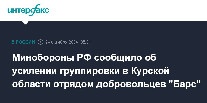 Москва. 24 октября. INTERFAX.RU - Добровольческий отряд "Барс" усилит российскую группировку в Курской области, сообщило Минобороны РФ в четверг.