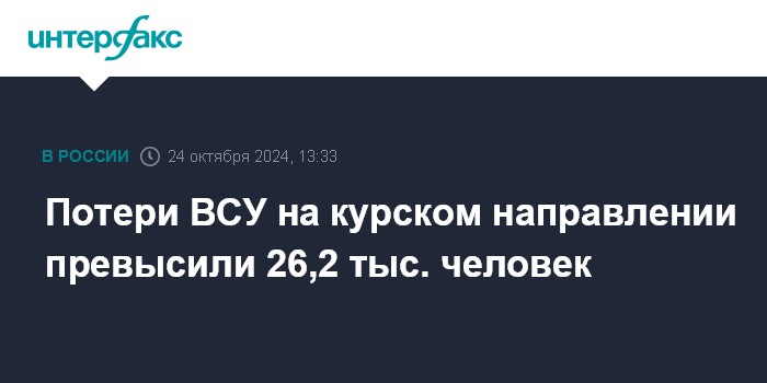 Москва. 24 октября. INTERFAX.RU - Минобороны России заявило в четверг, что потери вооруженных сил Украины (ВСУ) за все время боевых действий на курском направлении превысили 26,2 тыс. человек, за сутки потери украинской армии составили до 280 военнослужащих.