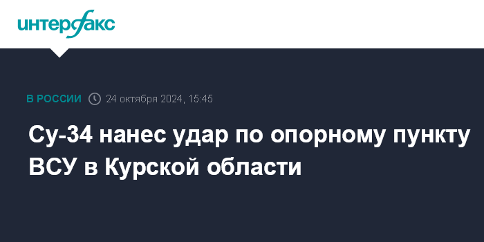 Москва. 24 октября. INTERFAX.RU - Бомбардировщик Су-34 нанес удар с применением авиабомб по опорному пункту ВСУ в приграничном районе Курской области, сообщили в Минобороны РФ.