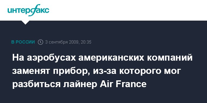 Москва. 3 сентября. INTERFAX.RU – Федеральное управление гражданской авиации США отдало распоряжение американским авиакомпаниям заменить на аэробусах прибор, предположительно приведший к крушению лайнера Air France в Атлантическом океане, сообщает в четверг телеканал CNN.