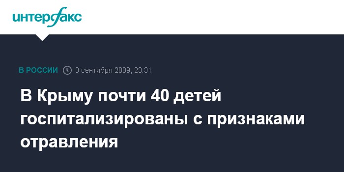 Киев. 3 сентября. ИНТЕРФАКС-УКРАИНА - В Джанкое (Автономная Республика Крым) около 40 детей госпитализированы с признаками отравления.