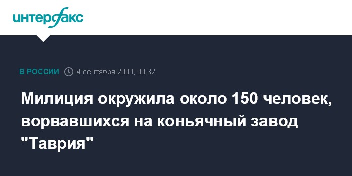 Киев. 4 сентября. ИНТЕРФАКС-УКРАИНА - Милиция Новой Каховки блокировала около 150 человек, ворвавшихся на территорию коньячного завода "Таврия" и открывших там стрельбу