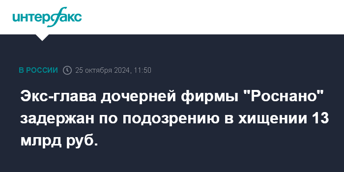 Экс-глава дочерней фирмы "Роснано" задержан по подозрению в хищении 13 млрд руб.
