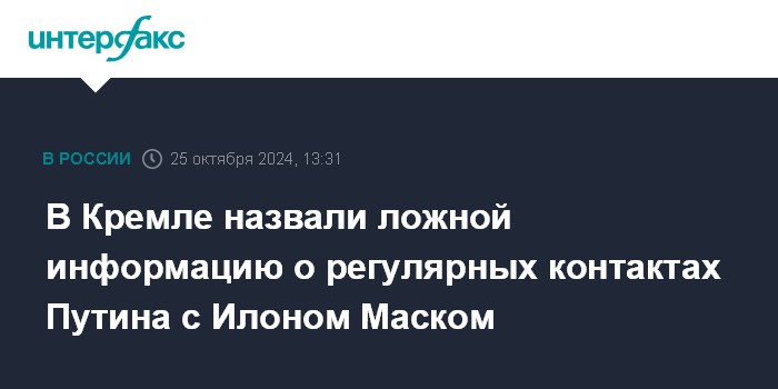 Москва. 25 октября. INTERFAX.RU - В Кремле опровергли сообщения западных СМИ о том, что президент РФ Владимир Путин регулярно общается с американским миллиардером Илоном Маском и даже просил его не активировать Starlink над Тайванем.