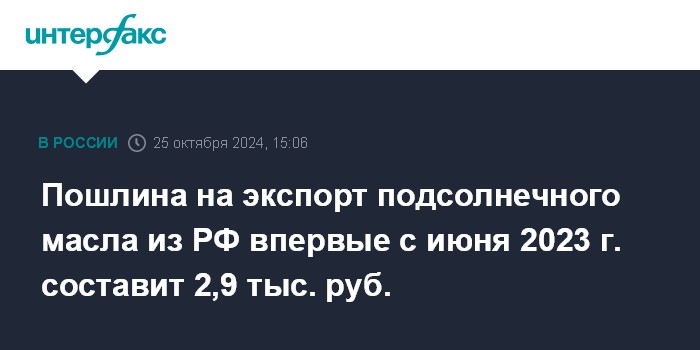 Москва. 25 октября. INTERFAX.RU - Пошлина на экспорт подсолнечного масла из РФ, больше года державшаяся на нуле, в ноябре составит 2 891,1 рубля за тонну.