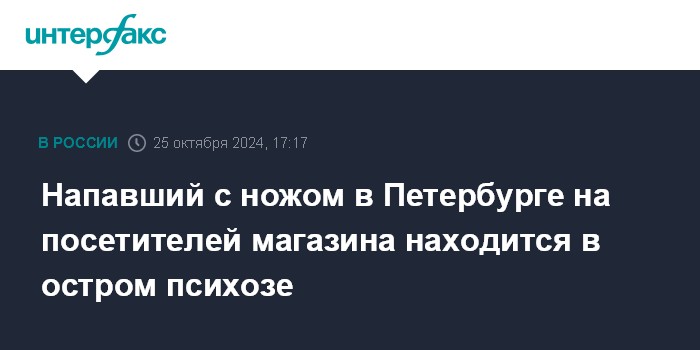 Москва. 25 октября. INTERFAX.RU - Анализы напавшего на посетителей магазина в Петербурге показали, что мужчина находился в состоянии острого психоза, сообщил журналистам директор НИИ Скорой помощи Вадим Мануковский в пятницу.