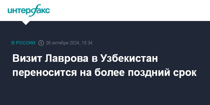 Москва. 26 октября. INTERFAX.RU - Глава МИД РФ Сергей Лавров перенесет на более поздний срок свой визит в Узбекистан, планировавшийся на 28-29 октября, сообщает сайт российского внешнеполитического ведомства.