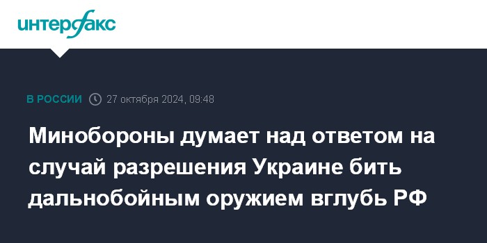 Москва. 27 октября. INTERFAX.RU - Минобороны РФ будет предлагать различные варианты ответа в случае разрешения Украине наносить удары западным дальнобойным оружием вглубь России, думает об этом, заявил президент РФ Владимир Путин.