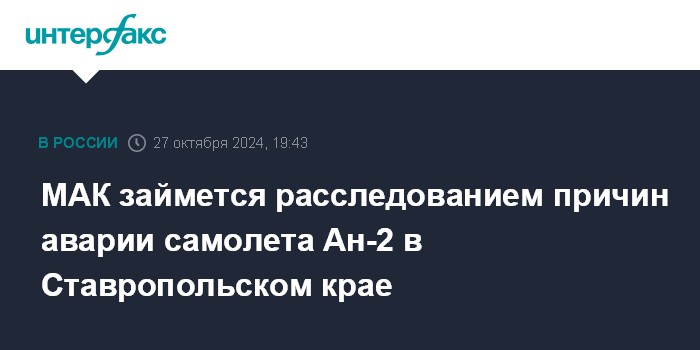 Москва. 27 октября. INTERFAX.RU - Жесткая посадка самолета Ан-2 в Предгорном округе Ставрополья, которая произошла в воскресенье днем, классифицируется как авария, расследованием займется Межгосударственный авиационный комитет с участием Южного МТУ Росавиации.