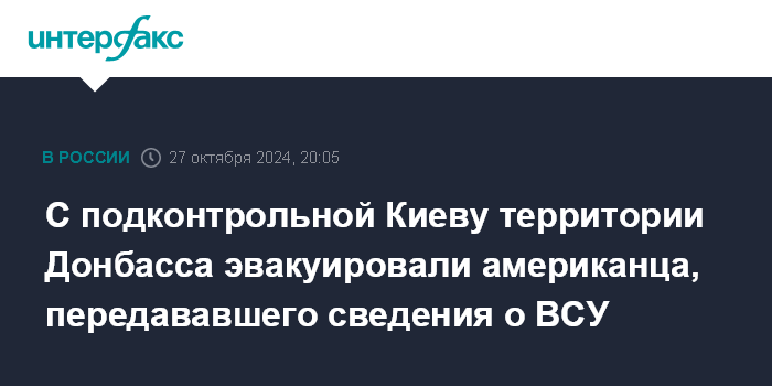 Москва. 27 октября. INTERFAX.RU - Гражданин США, который предоставлял разведданные российским военным, эвакуирован с подконтрольной Киеву территории в Донбассе, сообщает штаб обороны Донецкой народной республики.