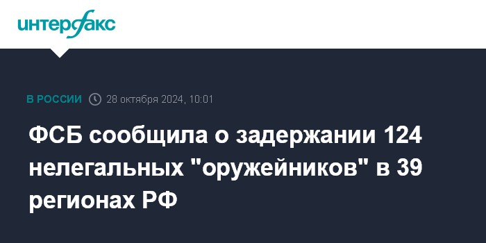 Москва. 28 октября. INTERFAX.RU - В ФСБ сообщили о задержании 124 человек, причастных к незаконному обороту оружия в 39 субъектах РФ, прекращена работа 59 подпольных мастерских по переделке оружия.