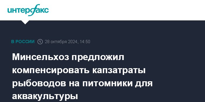 Москва. 28 октября. INTERFAX.RU - Минсельхоз предлагает на 25% компенсировать капзатраты рыбоводов на создание и модернизацию питомников по выращиванию рыбопосадочного материала для разведения лососевых и ценных морепродуктов. Соответствующий проект постановления правительства размещен на сайте regulation.gov.ru.