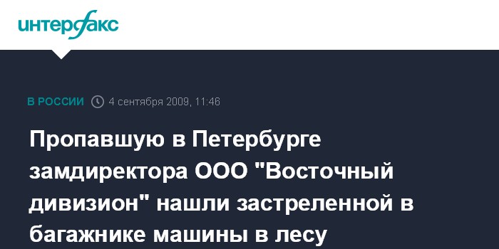 Москва. 4 сентября. INTERFAX.RU – В лесу под Петербургом в багажнике автомобиля обнаружено тело пропавшей в конце августа заместителя директора ООО "Восточный дивизион" И.Дубровиной, сообщил "Интерфаксу" источник в правоохранительных органах. 33-летняя Дубровина 29 августа уехала на своем автомобиле Honda Accord из офиса компании.