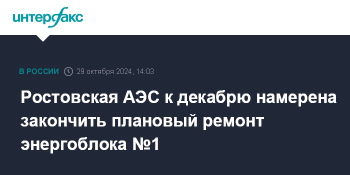 Москва. 29 октября. INTERFAX.RU - Ростовская АЭС к 30 ноября планирует завершить планово-предупредительный ремонт (ППР) энергоблока №1, сообщил "Интерфаксу" заместитель губернатора Ростовской области Игорь Сорокин.