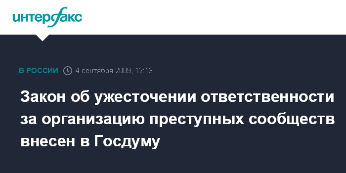 Москва. 4 сентября. INTERFAX.RU – Президент России Дмитрий Медведев внес в Госдуму проект закона, ужесточающего уголовную ответственность за организацию преступных сообществ.