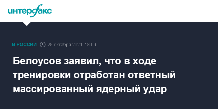 Москва. 29 октября. INTERFAX.RU - Вооруженные силы России в ходе тренировки под руководством президента РФ Владимира Путина отрабатывают массированный ядерный удар стратегическими наступательными силами в ответ на ядерный удар противника, сообщил министр обороны РФ Андрей Белоусов.