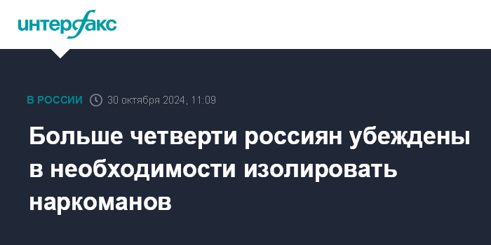 Москва. 30 октября. INTERFAX.RU - Порядка 26% россиян считают, что людей, принимающих наркотические вещества, необходимо изолировать от общества, следует из результатов опроса ВЦИОМ, опубликованного в среду на сайте социологического центра.