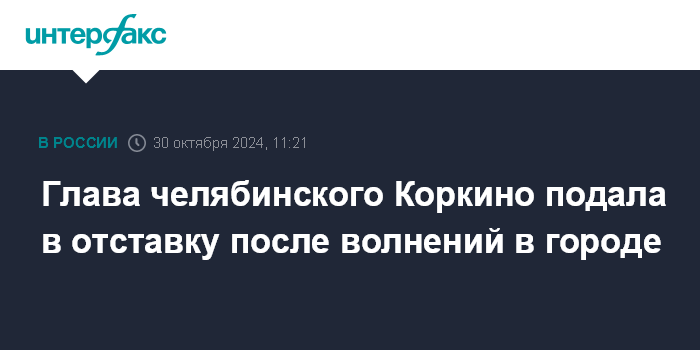 Москва. 30 октября. INTERFAX.RU - Глава города Коркино в Челябинской области, где в конце минувшей недели прошли волнения после убийства женщины-таксиста, подала в отставку.