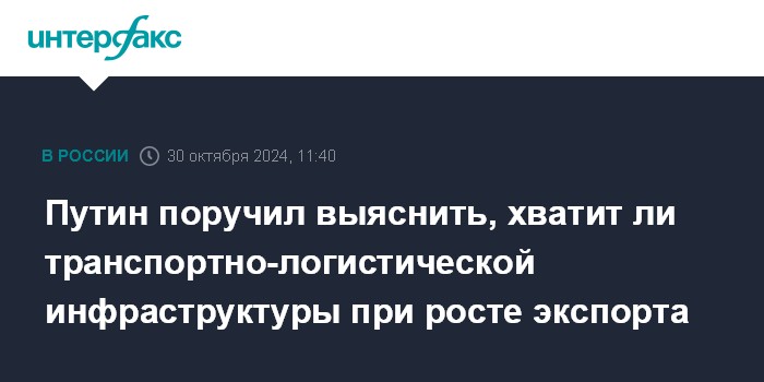 Москва. 30 октября. INTERFAX.RU - Президент РФ Владимир Путин поручил правительству совместно с заинтересованными субъектами РФ и РЖД к июню 2025 года провести анализ достаточности транспортно-логистической инфраструктуры для увеличения экспортных объемов.