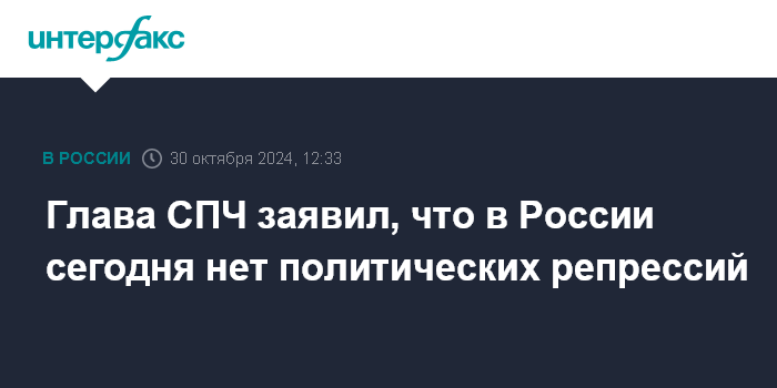 Москва. 30 октября. INTERFAX.RU - Глава Совета по правам человека при президенте РФ (СПЧ) Валерий Фадеев выразил убеждение, что в стране сегодня нет политических репрессий, назвал "санитарными мерами" ограничения, применяемые к тем, кто, по его словам, в противостоянии с Западом фактически выступает на его стороне.