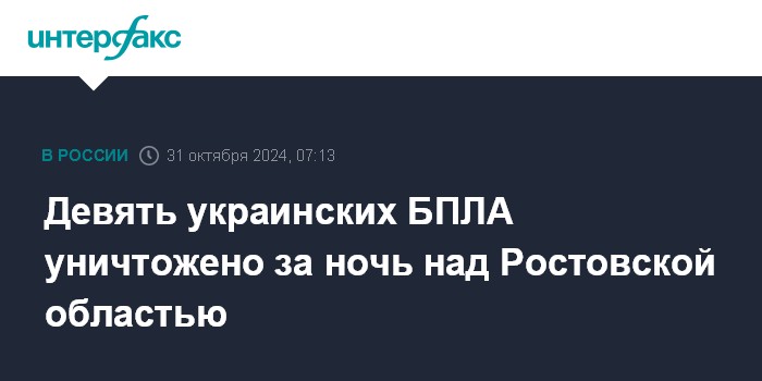 Москва. 31 октября. INTERFAX.RU - В ночь на четверг над Ростовской областью сбито девять украинских беспилотников, сообщил глава региона Василий Голубев.