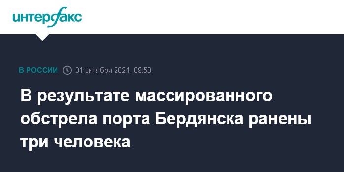 Москва. 31 октября. INTERFAX.RU - Губернатор Запорожской области Евгений Балицкий сообщил о трех пострадавших в результате обстрела порта Бердянска.