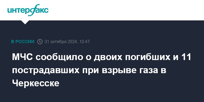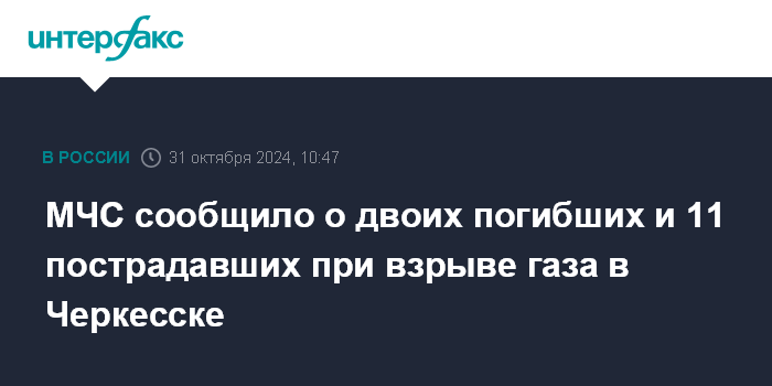 Москва. 31 октября. INTERFAX.RU - По данным МЧС, в результате взрыва газа в жилом доме в Черкесске погибли два человека, еще 11 пострадали, сообщает управление МЧС по Карачаево-Черкесии.