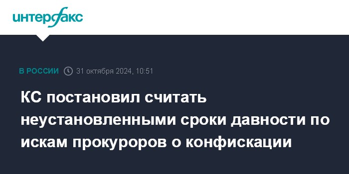Москва. 31 октября. INTERFAX.RU - Конституционный суд России запретил применять текущие сроки давности, установленные Гражданским кодексом, к антикоррупционным искам прокуроров об изъятии имущества коррупционеров в доход государства, и допустил их последующее установление, передал корреспондент "Интерфакса".