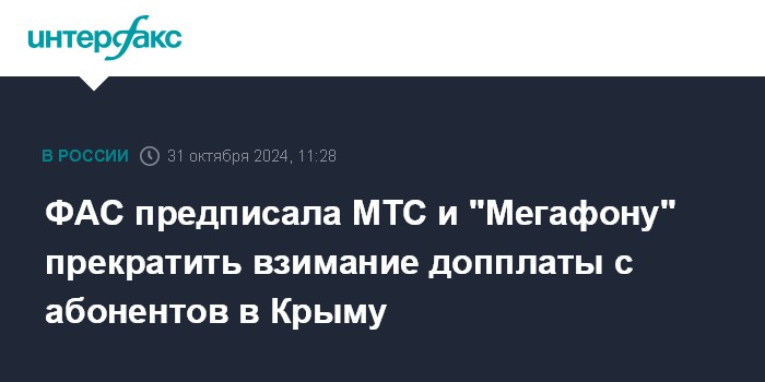 Москва. 31 октября. INTERFAX.RU - Федеральная антимонопольная служба (ФАС) выдала ПАО "МТС" и ПАО "Мегафон" предписания об отмене дополнительной платы для своих абонентов за пользование услугами связи на территории Крыма и Севастополя, сообщило ведомство.
