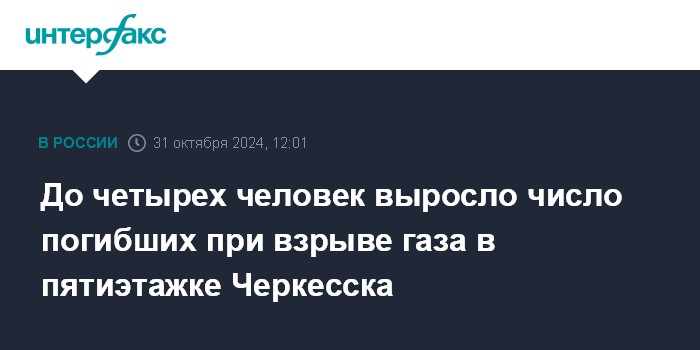 Москва. 31 октября. INTERFAX.RU - Четыре человека, по обновленным данным, погибли в результате взрыва газовоздушной смеси в многоквартирном доме в столице Карачаево-Черкесии Черкесске, сообщает ГУ МЧС России по КЧР в четверг.