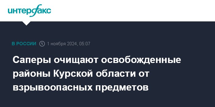 Москва. 1 ноября. INTERFAX.RU - Инженерные подразделения группировки войск "Север" проводят разминирование освобожденной территории в Курской области, сообщило Минобороны РФ.