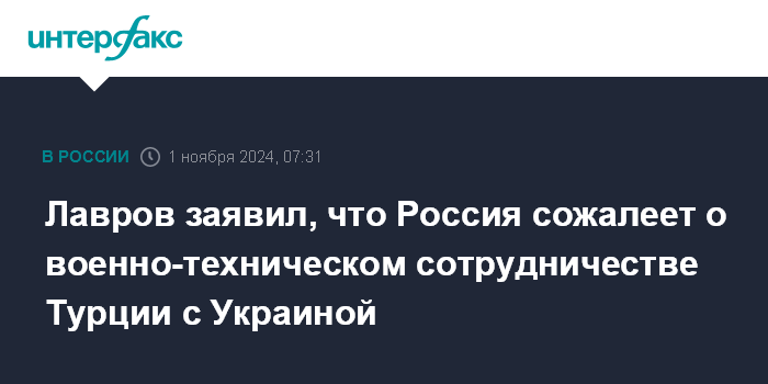 Москва. 1 ноября. INTERFAX.RU - В Москве ценят усилия Турции по содействию в урегулировании украинского кризиса, но сожалеют в связи с тем, что Анкара продолжает военно-техническое сотрудничество с Киевом, заявил глава МИД РФ Сергей Лавров.