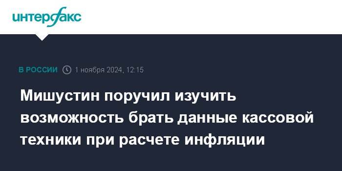 Москва. 1 ноября. INTERFAX.RU - Глава правительства РФ Михаил Мишустин поручил ведомствам вместе с Банком России проработать возможность использования агрегированных данных контрольно-кассовой техники (ККТ) при расчете инфляции.