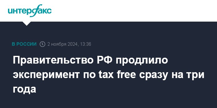 Москва. 2 ноября. INTERFAX.RU - Эксперимент по внедрению tax free в России, продолжающийся с 2018 года, планируется продлить еще на три года - до конца 2027 года. Соответствующее постановление утверждено правительством РФ.