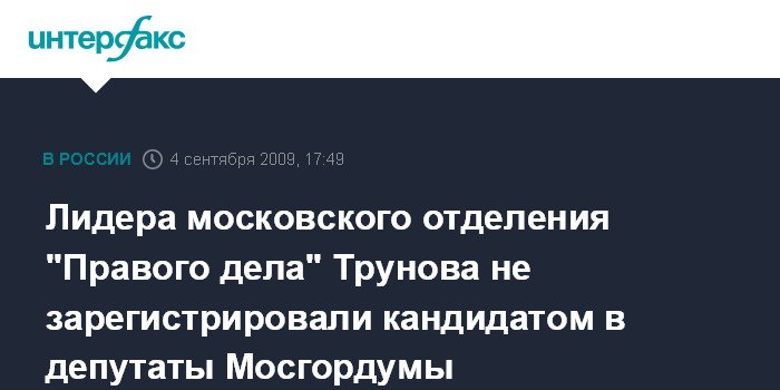 Москва. 4 сентября. INTERFAX.RU - Лидеру московского отделения партии "Правое дело" Игорю Трунову отказано в регистрации в качестве кандидата в депутаты Московской городской Думы.