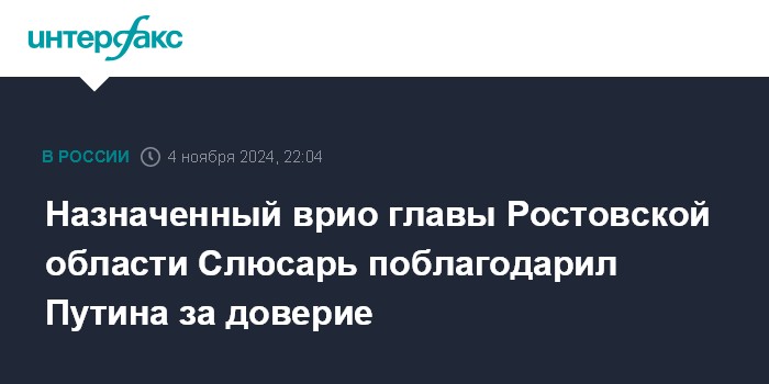 "Большое спасибо за высокое доверие. Для меня это возможность вернуться на мою малую донскую землю, родину, возглавить регион в этот непростой период", - сказал Слюсарь в ходе встречи с президентом РФ, которая транслировалась в эфире телеканала "Россия 24".