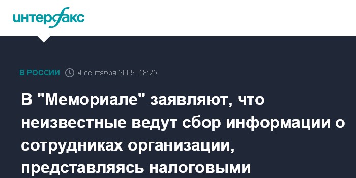 Москва. 4 сентября. INTERFAX.RU - Российский правозащитный центр "Мемориал" заявляет, что неизвестные люди, представляющиеся сотрудниками налоговой инспекции, собирают информацию о руководстве этой неправительственной организации.