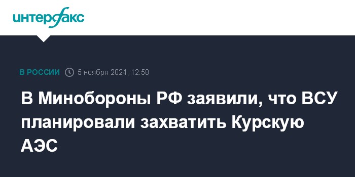 Москва. 5 ноября. INTERFAX.RU - В министерстве обороны России сообщили, что при вторжении в Курскую область вооруженные силы Украины (ВСУ) планировали захватить атомную электростанцию.