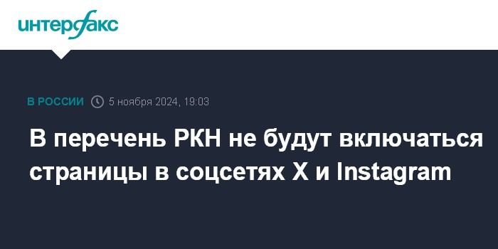 Москва. 5 ноября. INTERFAX.RU - Минцифры России поясняет, что владельцам страниц в заблокированной на территории РФ соцсети X (ранее Twitter), а также в запрещенном Instagram (принадлежит Meta, признана судом экстремистской и запрещена в РФ) не нужно регистрироваться в перечне в Роскомнадзора (РКН).