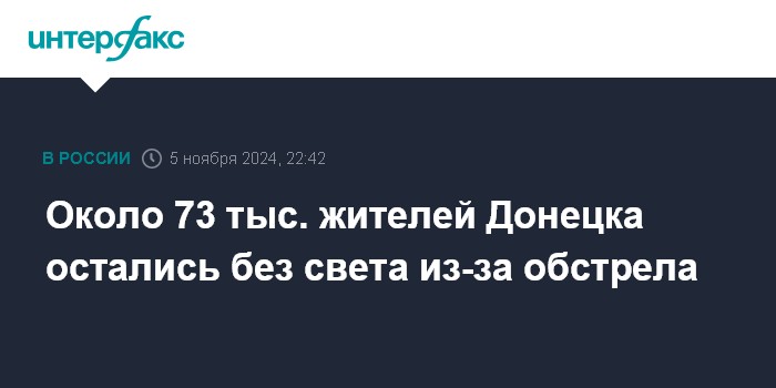 Москва. 5 ноября. INTERFAX.RU - Часть Донецка в ДНР осталась без электроэнергии в результате обстрела, сообщил глава городской администрации Алексей Кулемзин.