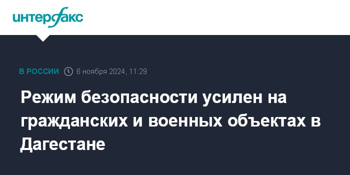 Москва. 6 ноября. INTERFAX.RU - Меры безопасности ужесточили на гражданских и военных объектах в Дагестане после уничтожения БПЛА над Каспийском, сообщается в телеграм-канале администрации главы республики в среду.